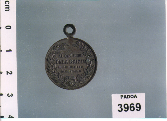 D/ SOCIETA' DEL CARNEVALE IN FIRENZE, MASCHERA; R/ AL CAV. PROF./ ENEA BRIZZI/ IL CONSIGLIO/ DIRETTIVO, ENTRO CORONA DI QUERCIA E ALLORO; NEL NASTRO, 1870