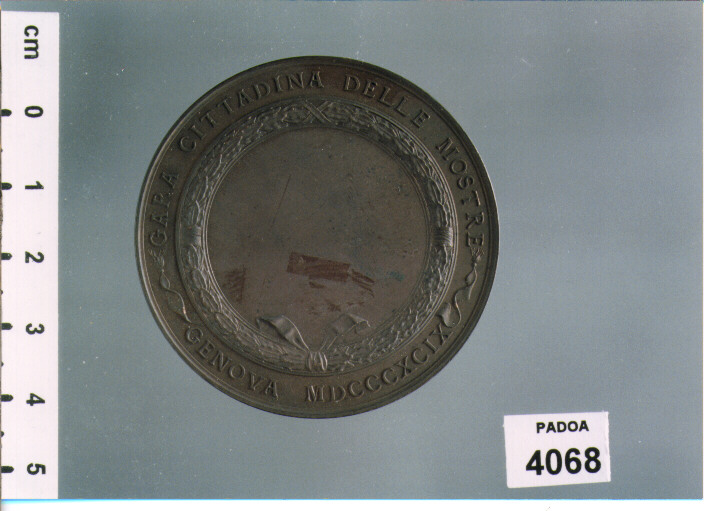 D/ VIII.O CENTENARIO DELLA TRASLAZIONE DELLE CENERI DI S. GIOVANNI BATTISTA, S. GIOVANNI SEDUTO CON LA CROCE NELLA MANO S.; R/ GARA CITTADINA DELLEMOSTRE GENOVA MDCCCXCIX, CAMPO VUOTO IN CORONA DI ALLORO