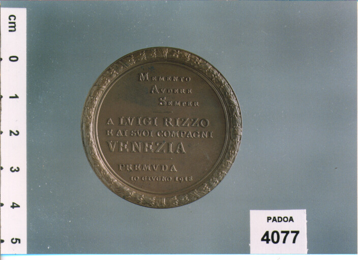 D/ LEONE DI S. MARCO TIENE APERTO UN LIBRO; R/ MEMENTO/ AVDERE/ SEMPER/ ALVIGI RIZZO/ E AI SVOI COMPAGNI/ VENEZIA/ PREMVDA/ 10 GIVGNO 1918