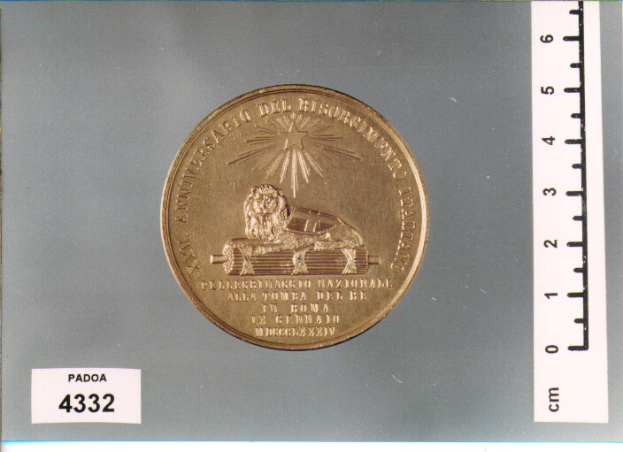 D/ CAMMILLO CAVOUR VITTORIO EMANUELE II GIUSEPPE MAZZINI GIUSEPPE GARIBALDI; NEL CAMPO QUATTRO TESTE; SUL BORDO, L. GIORGI F.; R/ XXV. ANNIVERSARIODEL RISORGIMENTO ITALIANO; LEONE ACCOVACCIATO SU FASCIO; SOTTO, PELLEGRINAGGIO NAZIONALE/ ..