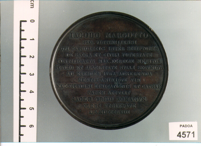 D/ VBI PETRVS IBI ECCLESIA FORTITER ET SVAVITER, LA RELIGIONE STANTE STRINGE LA MANO ALLA STAMPA CLERICALE; IN ESERGO, C. VOIGT; R/ IACOBO MARGOTTO/ SAC. VINTIMILIENSI/ QVI CATHOLICOS INTER SCRIPTORES/ DE SACRA ET CIVILI POTESTATE/ ..