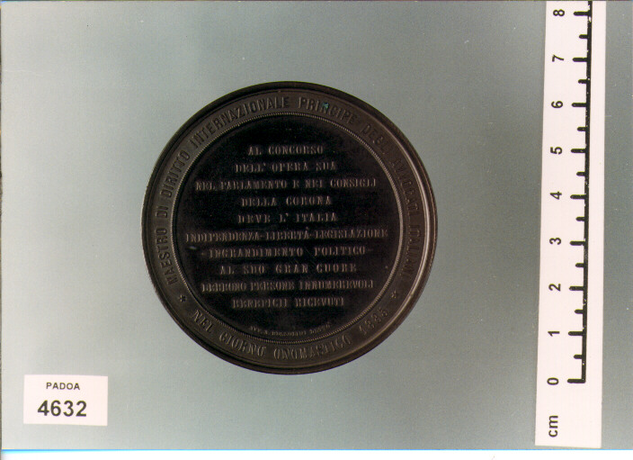 D/ PASQUALE STANISLAO MANCINI, BUSTO A S.; SOTTO, G. VAGNETTI FECE IN ROMA; R/ MAESTRO DI DIRITTO INTERNAZIONALE PRINCIPE DEGLI AVVOCATI ITALIANI. NEL GIORNO ONOMASTICO 1885; NEL CAMPO, AL CONCORSO/ DELL'OPERA SUA/ NEL PARLAMENTO E NEI CONSIGLI/ ..