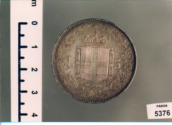 D/ UMBERTO I RE D'ITALIA, TESTA A D.; NEL TAGLIO, SPERANZA; SOTTO, 1878; R/ STEMMA SABAUDO CORONATO E CIRCONDATO DAL COLLARE DELLA SS. ANNUNZIATA; NEL CAMPO A S., L; A D., 5, ENTRO CORONA DI QUERCIA E ALLORO; SOTTO, R