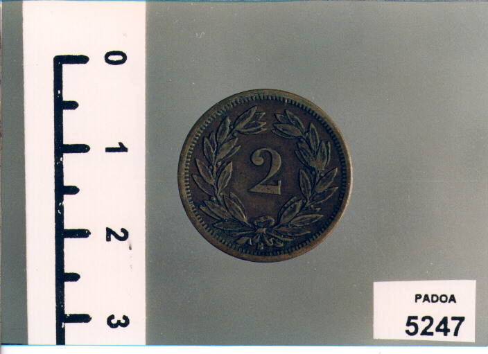 D/ HELVETIA, STEMMA TRA RAMI DI QUERCIA E ALLORO; SOTTO, 1890; R/ 2, ENTRO CORONA DI ALLORO; SOTTO, B