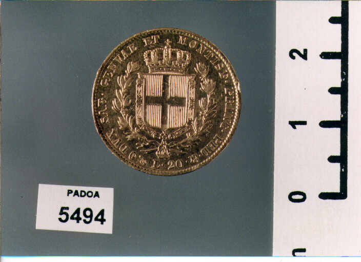 D/ CAR. ALBERTVS D. G. REX SARD. CYP. ET HIER., TESTA A S.; NEL TAGLIO, F.; SOTTO, 1834; R/ DVX SAB. GENVAE ET MONTISF. PRINC. PED. &. L. 20, STEMMA SABAUDO CORONATO TRA DUE RAMI DI ALLORO; SOTTO, P, ENTRO OVALE ED ANCORA. TAGLIO: RIGATO