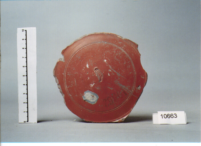 FONDO LEGGERMENTE CONCAVO CON CERCHI CONCENTRICI INCISI ALL'INTERNO E GRADINO INTERNO TRA PARETE E FONDO, PIEDE AD ANELLO