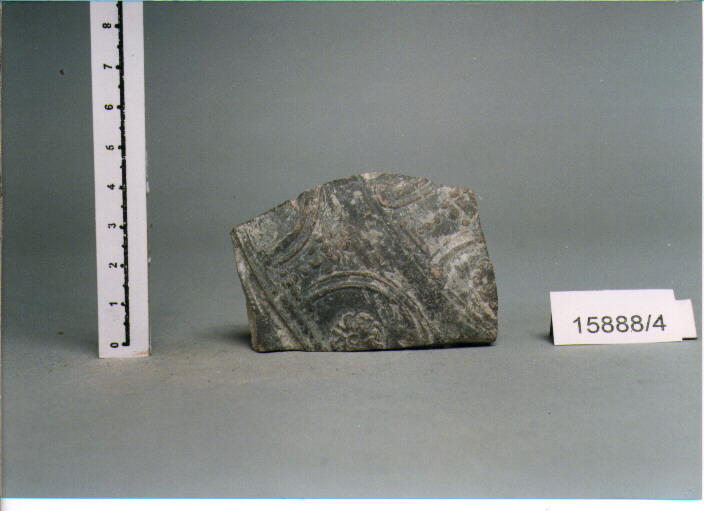 BREVE TRATTO DELL'ORLO; FASCIA SUPERIORE E INFERIORE CON IDENTICA DECORAZIONE: FESTONI A DUE LINEE TRA CUI ELEMENTO NON ID. (GRAPPOLO O MASCHERA SILENICA) PENDENTE, E ROSETTA A OTTO PETALI ARROTONDATI. SUPERFICIE ANNERITAPER DIFETTO DI COTTURA