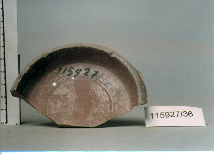 FONDO PIATTO DECORATO INTERNAMENTE CON STRIATURE A ROTELLA ENTRO CERCHI CONCENTRICI INCISI, ISCRIZIONE GRAFFITA SUL FONDO ESTERNO, PIEDE AD ANELLO;PERTINENTE A FORMA APERTA