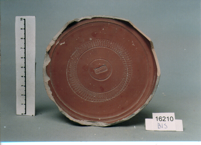 RESTI DI PARETE VERTICALE CON DECORAZIONE IMPRESSA. FONDO LEGGERMENTE CONVESSO. BASSO PIEDE AD ANELLO. SUL FONDO INTERNO, RIBASSATO, CIRCONFERENZA CONCENTRICA INCISA E DECORAZIONE A ROTELLA