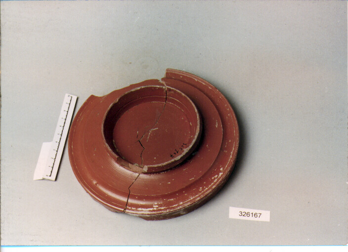 FONDO PIATTO SU CUI DUE COPPIE DI CERCHI INCISI; PIEDE AD ANELLO. GRAFFITO SUL FONDO ESTERNO