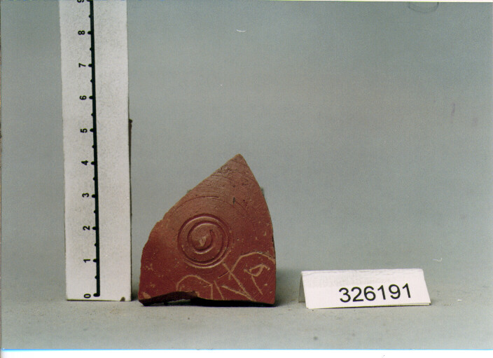 CONCAVO, ALL'INTERNO COPPIA DI CERCHI INCISI. SUL FONDO ESTERNO SPIRALE INCISA E GRAFFITO NON INTERPRETABILE