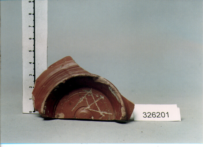 PIATTO, PARETE SVASATA CON ATTACCO SOTTOLINEATO ALL'INTERNO DA SOTTILE DOPPIA MODANATURA, PIEDE AD ANELLO; SUL FONDO INTERNO COPPIA DI CERCHI INCISI. SUL FONDO ESTERNO LETTERA GRAFFITA