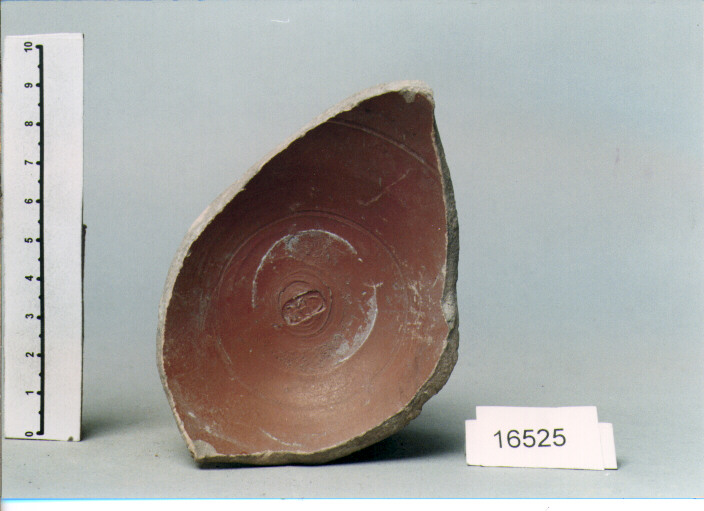 PARETE LEGGERMENTE CONVESSA, FONDO INTERNO CONCAVO CON CERCHIO INCISO, FONDO ESTERNO OMBELICATO, PIEDE AD ANELLO SOLCATO ALL'ESTERNO DA UNA SCANALATURA ORIZZONTALE