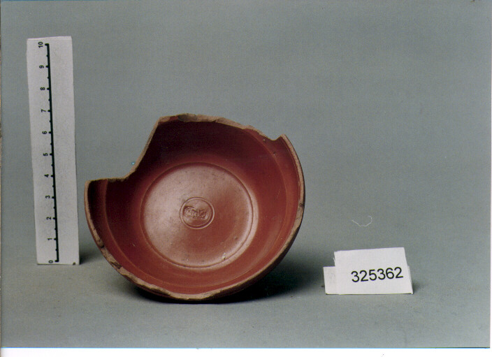 ORLO CONVESSO CON DECORAZIONE A ROTELLA, VASCA DECORATA ALL'ESTERNO DA UNA SOTTILE SCANALATURA, FONDO INTERNO DECORATO DA UN SOTTILE ANELLO IMPRESSO, PIEDE AD ANELLO CON PROFILO ESTERNO SAGOMATO. VERNICE LUCIDA