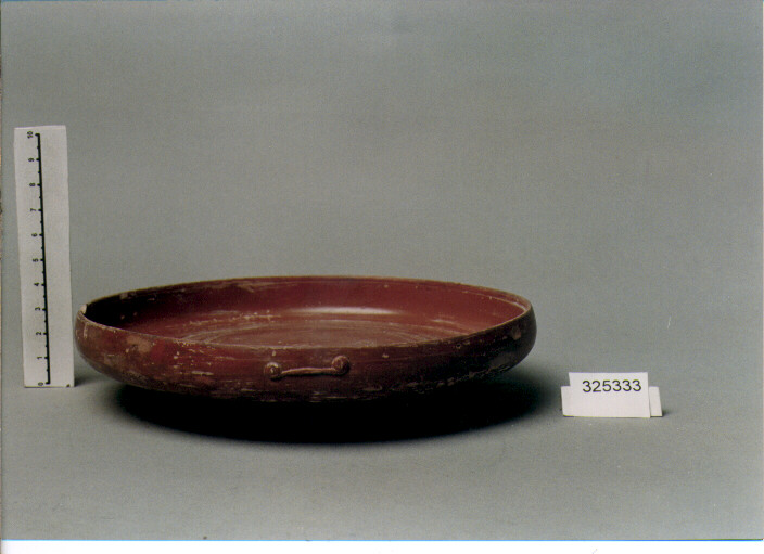 ORLO LEGGERMENTE RIENTRANTE SU CUI SONO APPLICATI DUE MOTIVI A DOPPIA SPIRALE, FONDO PIATTO, SUL FONDO INTERNO DOPPIA SERIE DI ANELLI CONCENTRICI TRA LE QUALI DECORAZIONE A ROTELLA, PIEDE AD ANELLO. VERNICE LUCIDA