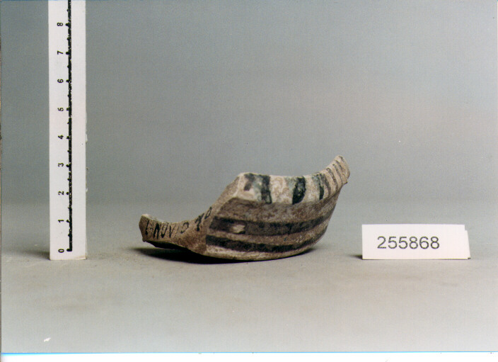 ORLO OBLIQUO RIENTRANTE, PARETE VERTICALE, FONDO CONVESSO. SMALTO BIANCO,FASCE MANGANESE ALL'ESTERNO, SULLA PARETE. ALL'INTERNO MOTIVO A ONDE E FASCIA MANGANESE E COBALTO DILUITO