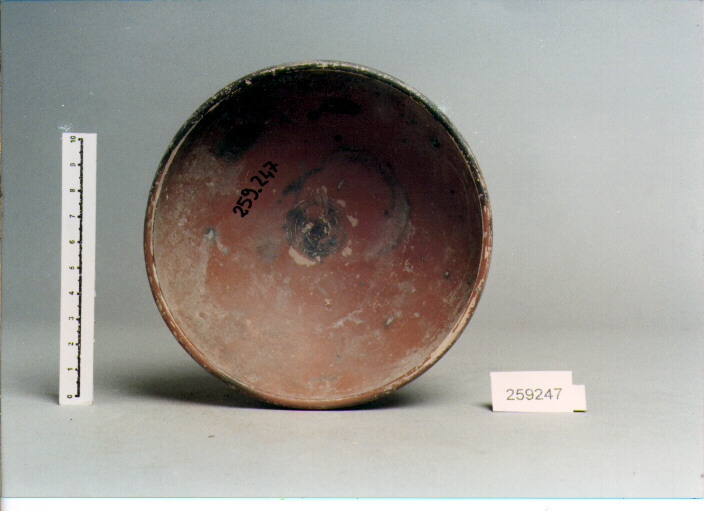 VASCA LIEVEMENTE CARENATA, PIEDE TRONCOCONICO CON IL FONDO ESTERNO OMBELICATO. ALL'ESTERNO, IN PROSSIMITA' DEL PIEDE GRAFFITO A CROCE E IMPRONTE DELLA PRESA DELLE DITA. VERNICE ROSSA CON SFUMATURE NERE; PIEDE RISPARMIATO