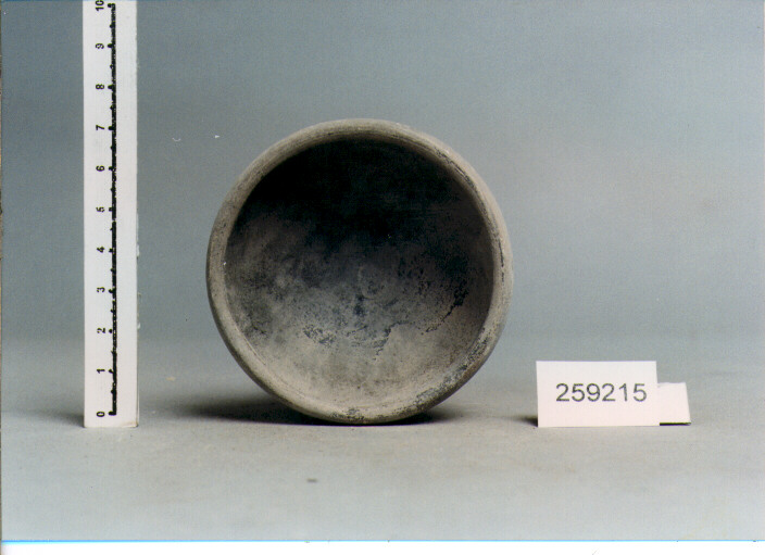 ORLO RIENTRANTE, VASCA LIEVEMENTE CARENATA, PIEDE TRONCOCONICO CON IL FONDO ESTERNO OMBELICATO. VERNICE NERA OPACA