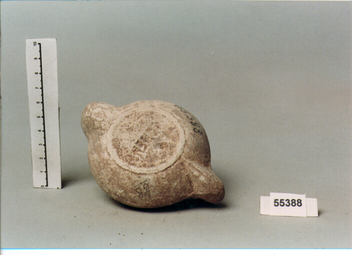 DISCO CONCAVO DECORATO CON SCENA NON IDENTIFICABILE (DUE FIGURE DI CUI UNA DI PROFILO A DESTRA). SULLA SPALLA TRALCIO VEGETALE, PIEDE AD ANELLO. VERNICE ROSSO-BRUNA SCROSTATA
