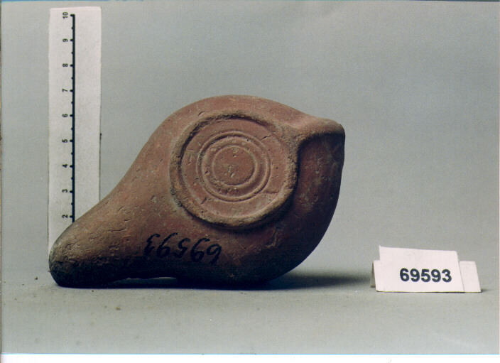 SPALLA DECORATA DA PALMETTE ALTERNATE A TRIANGOLI, SUL DISCO TESTA GALEATA RIVOLTA A SINISTRA; PIEDE AD ANELLO CON DUE CERCHI CONCENTRICI A RILIEVO. VERNICE ARANCIONE SCURO