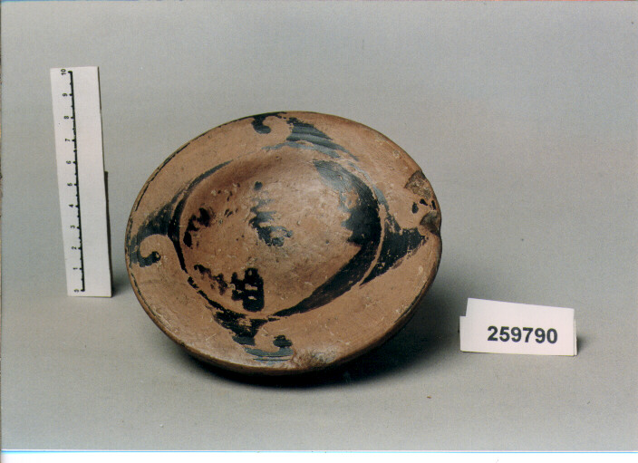 LABBRO ORIZZONTALE CON ORLO PENDENTE, VASCA POCO PROFONDA, ALTO PIEDE A TROMBA. SUL LABBRO E' DIPINTO A VERNICE NERA UN MOTIVO AD ONDE, CHE INQUADRANO SUL FONDO INTERNO DELLA VASCA UNA TESTA MULIEBRE