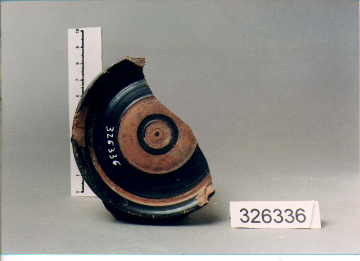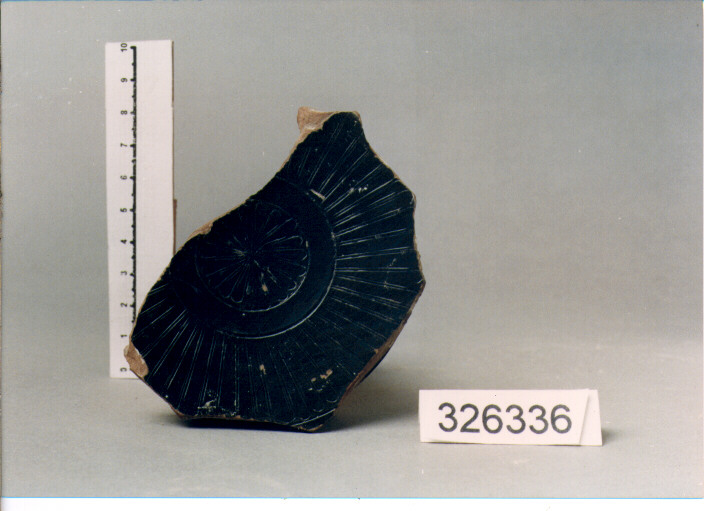 LEGGERMENTE CONCAVO, PIEDE AD ANELLO. ALL'INTERNO DECORAZIONE INCISA: AMPIA FASCIA DI BACCELLI RADIALI AL CENTRO ROSONE. SUL FONDO ESTERNO FASCE RISPARMIATE. VERNICE LUCENTE