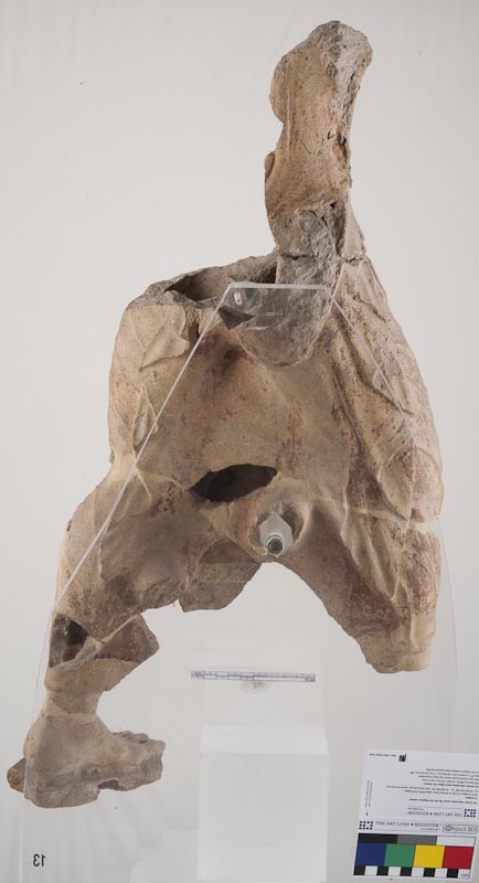 Statua femminile panneggiata realizzata a tuttotondo. La figura è in movimento verso sinistra, con la gamba destra avanzata. Sulla coscia sinistra il panneggio è sollevato dalla mano. è abbigliata con una leggera veste molto aderente ed un hymation che scende davanti con pieghe rigide e simmetriche. Frammento verosimilmente pertinente ad una statua acroteriale, della quale non è certa l''interpretazione come divinità. Argilla rosa con nucleo grigio, con sabbia ed inclusi di piccole dimensioni. Ingobbio della stessa argilla