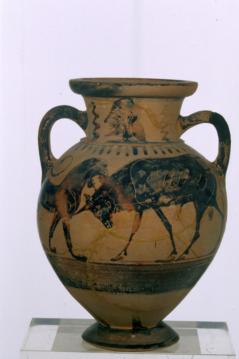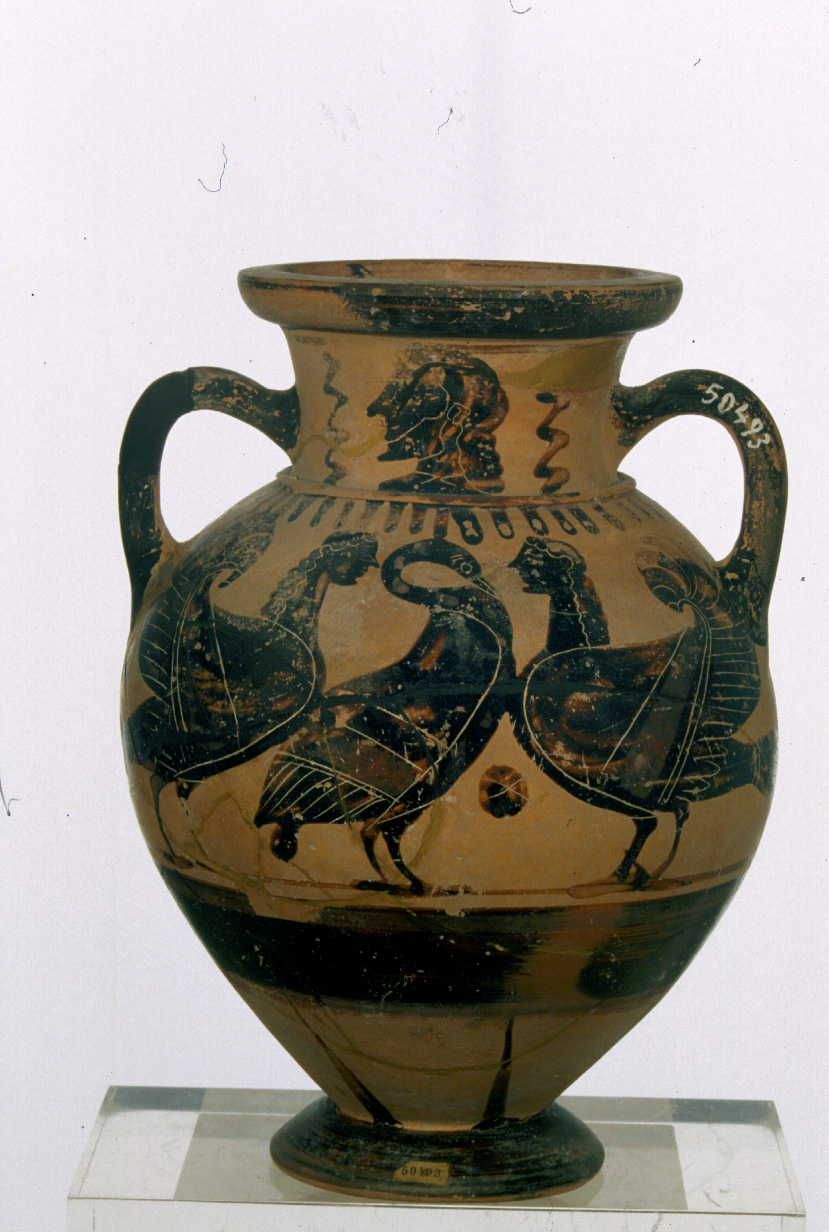A: leone e toro. B: oca tra sirene. Collo: testa virile barbata. In A: leone, verso destra, nell''atto di mordere un toro, verso sinistra. In B: tra due sirene affrontate,oca, verso destra. Tra l''oca e la sirena di destra , rosetta. Sul collo testa virile barbata di profilo, verso sinistra, tra due linee ondulate verticali; alla base del collo baccellature