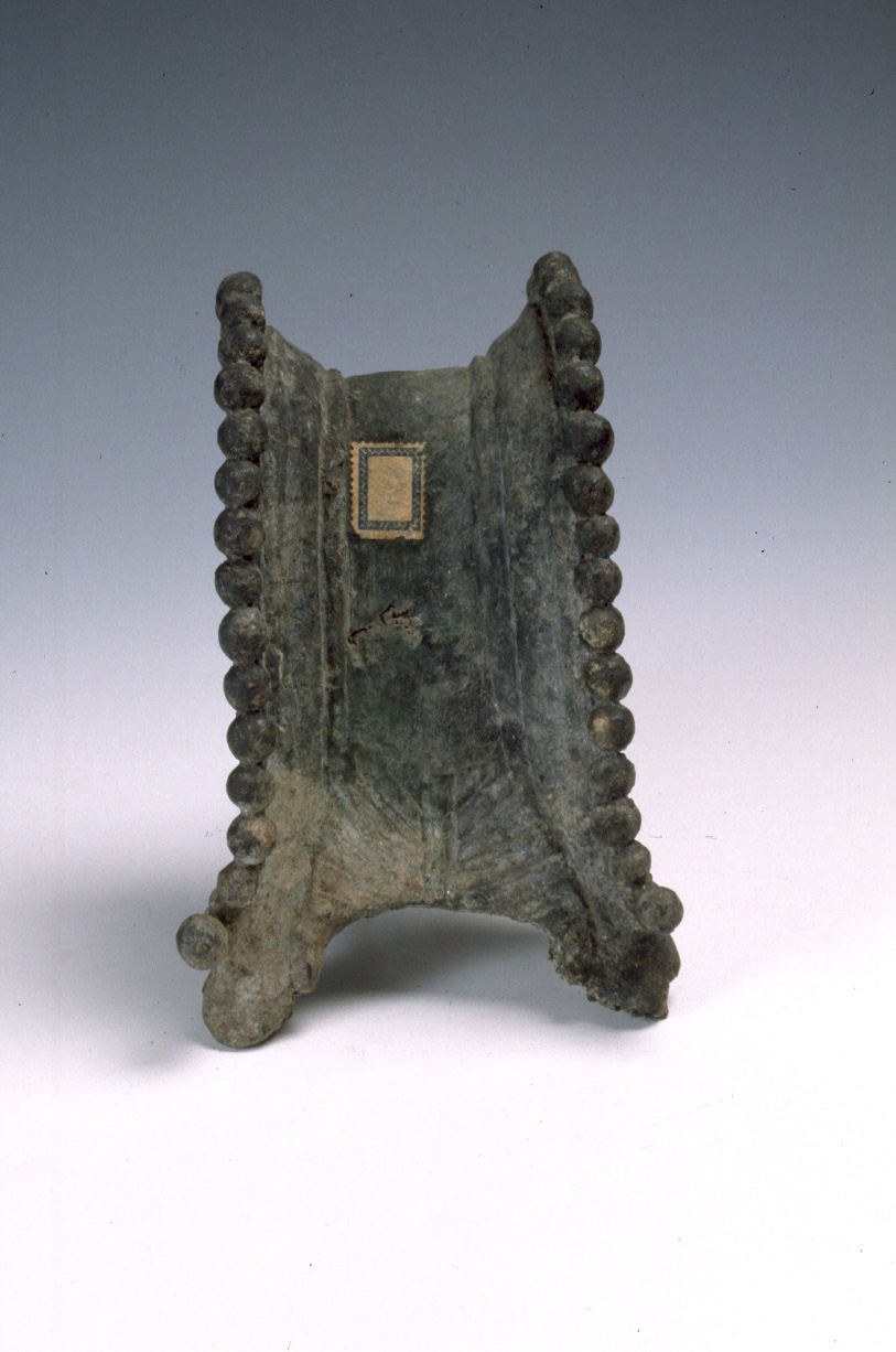 ansa sormontante a nastro decorato alla base da una foglia di acanto e all''estremità superiore da una conchiglia; ai lati due grandi volute dai margini perlati composte da una fascia decorata a linee incise orizzontali e campite da palmette e racemi fitomorfi. Bronzo fuso. Decorazione a matrice