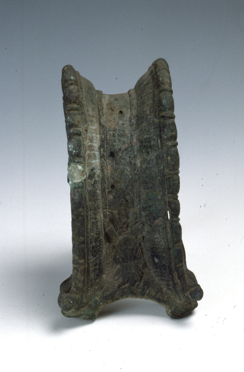 ansa sormontante a nastro decorato alla base da una foglia di acanto da cui nasce una palmetta a cinque foglie; ai lati due grandi volute dai margini ornati con astragali e perle, composte da una fascia scontornata, decorata a linee incise orizzontali e conclusa alla base da un ricciolo. Bronzo fuso. Decorazione a matrice