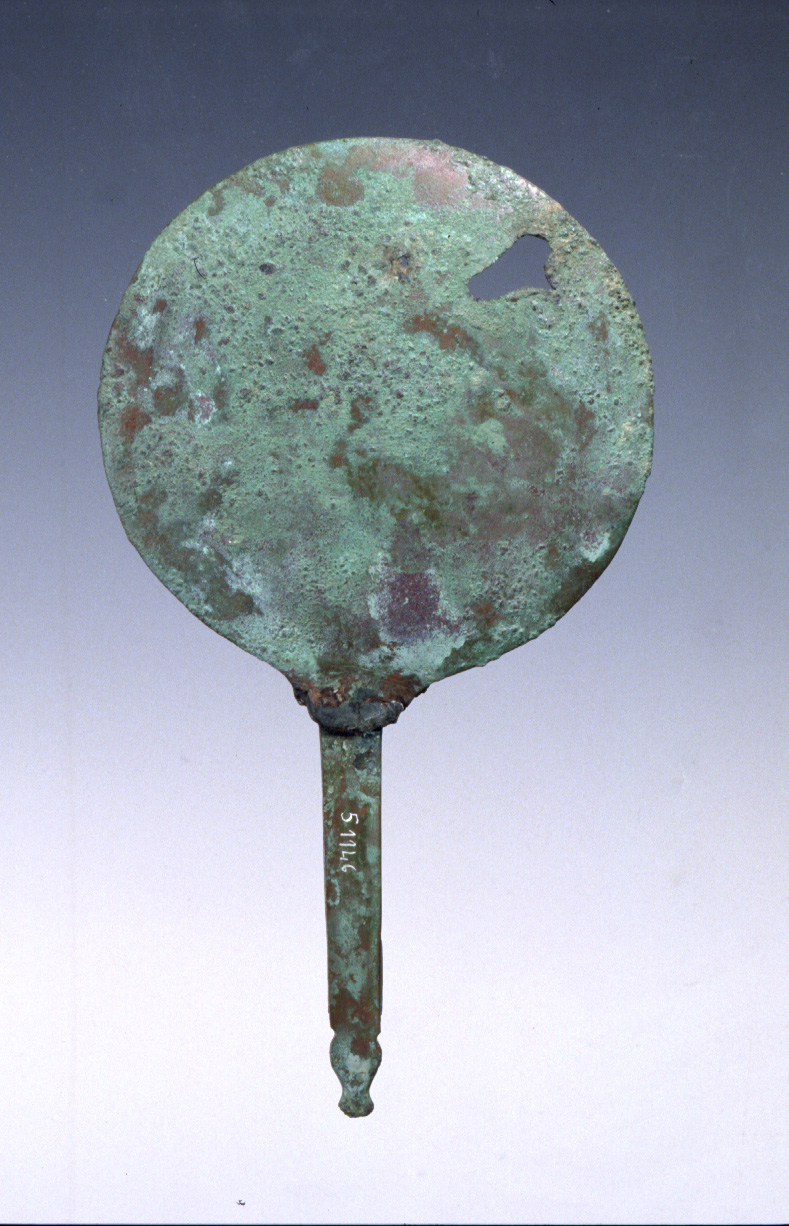 disco inciso con figura alata con lungo chitone e scudo nella sinistra, in basso a sinistra tre fiori. il manico è a sezione rettangolare, desinete a testa di cervide