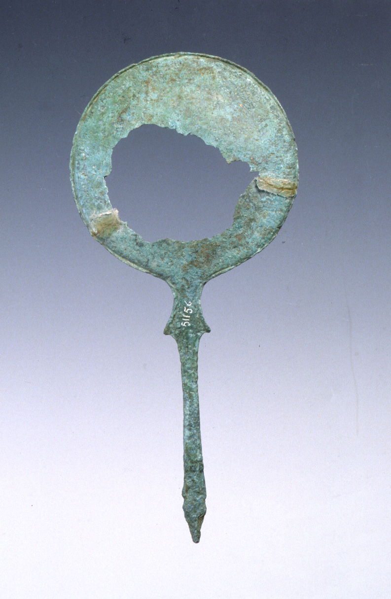 disco con incisione non leggibile, fascia a risalto con tralcio di foglie di acanto, targhetta con fianchi alti e fortemente incavati, manico fuso desinete a testa di cervide