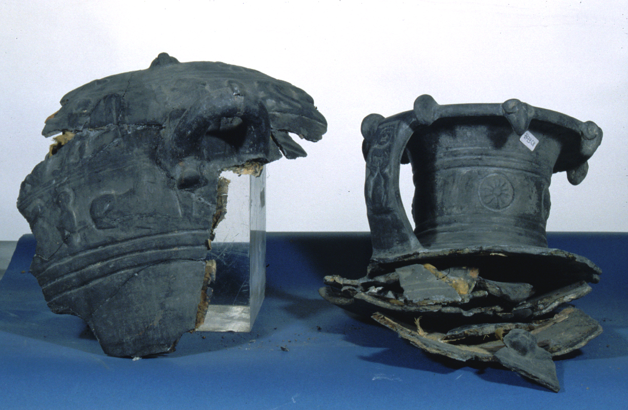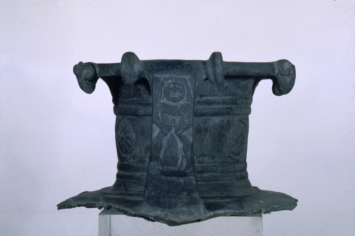 Ampio labbro, collo cilindrico distinto inferiormente da solcatura con due coppie di collarini a rilievo, spalla arrotondata sottolineata da costolatura, corpo ovoide, piede ad echino, ansa verticale a nastro con rotelle alla sommità impostata su orlo e spalla, due a bastoncello impostate obliquamente sulla massima espansione decorate con bastoncelli a rilievo ai lati. Decorazione a rilievo e a stampo, incisione: sull''orlo applicate 5 protomi di ariete, sul collo, tra i collarini, serie di 5 margherite; sull''ansa verticale coppia di Pegasi con gorgoneion centrale resi a stampo; corpo suddiviso in tre registri sovrapposti sottolineati da doppie costolature: quello superiore con palmette pendule impresse alternate a visi maschili barbati a rilievo caratterizzati dall''ovale molto allungato, capelli divisi in due bande sulla fronte e le ciocche laterali rese con segni graffiti sul vaso; sul registro mediano scena figurata con personaggio barbato di tipo orientale armato di lancia pos