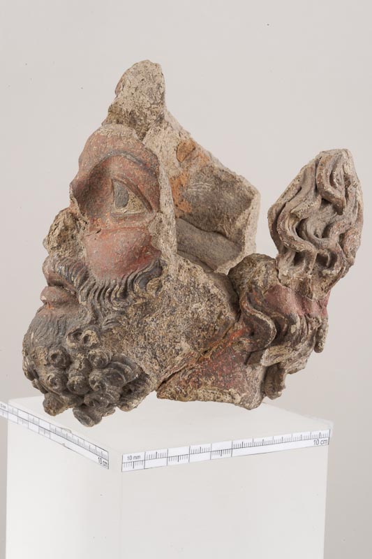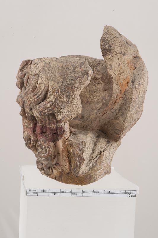 La testa, parte di una figura maschile, è cava all''interno. Ha il volto ovale, i capelli scendono ai lati del viso i baffi spioventi sulla barba resa con morbide ciocche chioccioliformi. I tratti del volto sono regolari, le labbra sono chiuse. La parte posteriore del lato destro non è lavorata