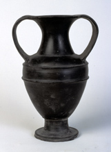 di tipo nicostenico. Orlo assottigliato, alto collo a profilo concavo, corpo ovoide rastremato, basso piede a tromba, anse a nastro impostate su orlo e spalla. Decorazione: sulla massima espansione del corpo una doppia costolatura orizzontale; anse a rilievo con metopa contornata da perlinatura includente tre felini gradienti a destra, il primo dei quali una pantera con muso di prospetto; alla sommità di ogni ansa una stella incisa a 6 raggi. Argilla 10YR 2/1 (black), superficie lucente