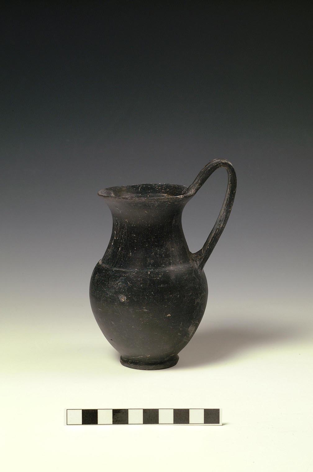 Labbro svasato, collo a profilo concavo, spalla distinta, corpo ovoidale, piede a disco inferiormente concavo, ansa sormontante a nastro impostata sull''orlo e sulla spalla. Argilla 10YR 3/1 (very dark gray), superficie lucente