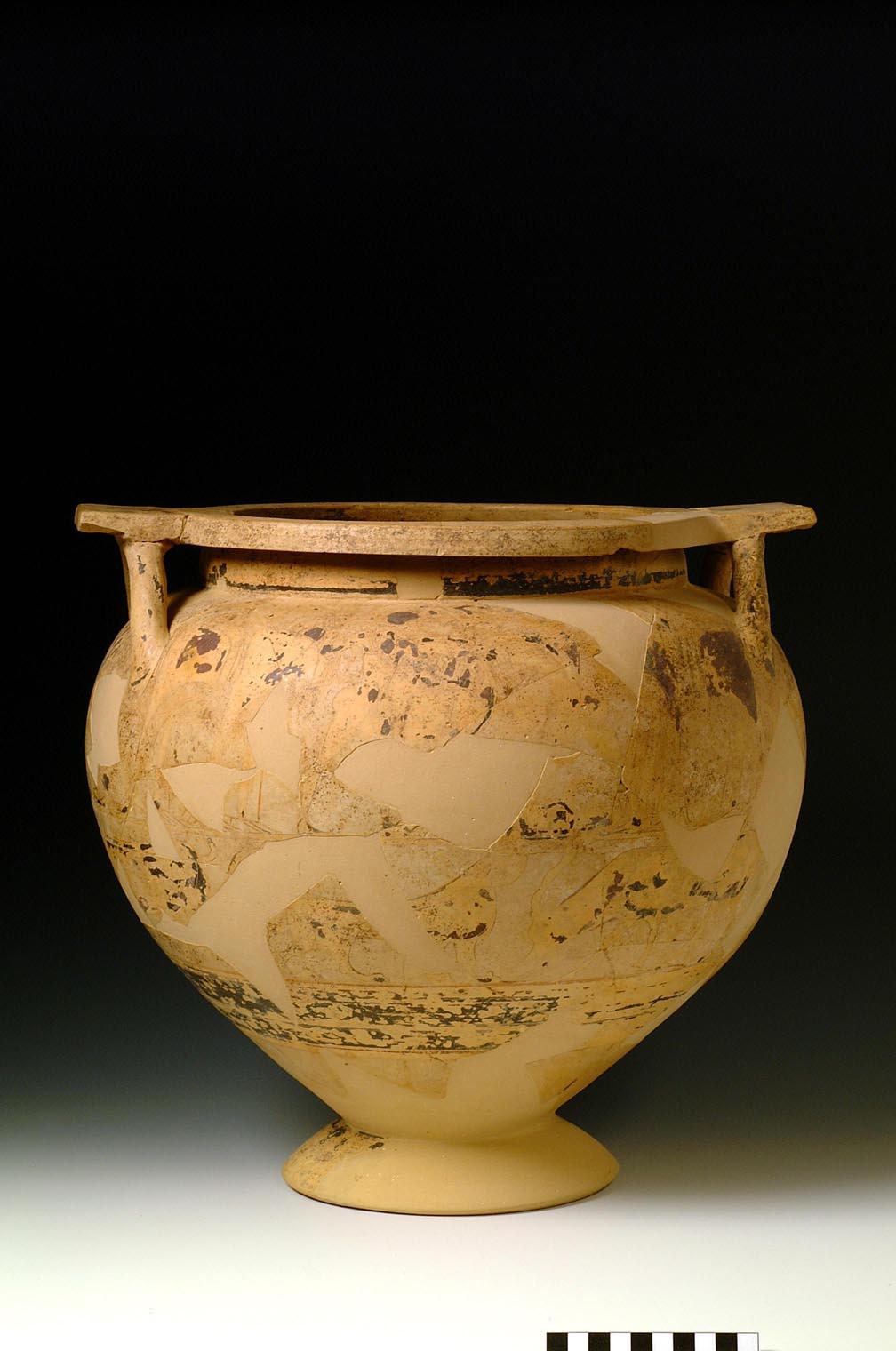 Cratere a colonnette con labbro piano e orlo verticale, collo cilindrico distinto, spalla arrotondata, corpo ovoide, piede troncoconico, anse verticali a bastoncello impostate sulla spalla e raccordate al labbro mediante una placchetta trapezoidale. Decorazione: all''interno del collo, fascia nera sovrapposta a fascia paonazza; interno del corpo dipinto. Sull''orlo serie continua di tremoli obliqui, sul piano delle anse, sfingi verso destra. Lato A, registro superiore: scena di duello tra due opliti al centro armati di elmo, scudo, lancia; per terra tra loro, guerriero disteso ferito con la mano destra al capo; ai lati, da ogni parte, sei figure femminili che assistono al combattimento con manto bordato; tra i due armati un volatile gradiente a sinistra. Lato B, registro superiore: scena di banchetto con tre klinai con cuscini ricoperte di un manto puntinato sulle quali sono tre coppie, l''uomo a destra e la donna a sinistra, con tazza in mano; sotto alle klinai, piccole trapeze con va