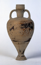 labbro ad echino rovescio, collo cilindrico, spalla arrotondata, corpo molto rastremato verso il piede troncoconico, anse a bastoncello impostate sul collo e sulla spalla. Decorazione: filetti sul labbro, e fasce brune all''interno; sulla spalla un cervo pascente a sinistra su ogni lato con riempitivi a rosetta incisa; sulla massima espansione, tra tre linee parallele, un fregio animale con cervo pascente affrontato a leone ed ancora un leone a sinistra; in campo numerosi rosette e punti come riempitivi; raggi presso il piede, filetti sul piede. Argilla 2.5Y 7/4 (pale yellow), vernice bruna disomogenea e poco coprentei; dettagli incisi e sovradipinti in paonazzo