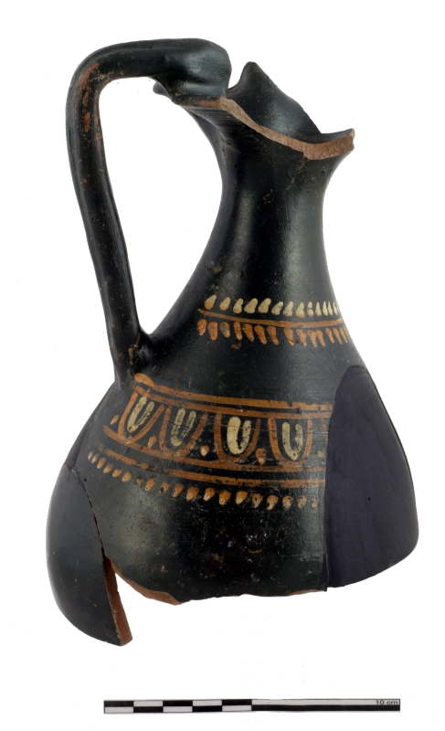 Bocca trilobata, ansa verticale a nastro modanato. Sul collo ramo con foglie orizzontale; sulla spalla serie di ovoli delimitati in basso da serie di trattini verticali. argilla 5 YR 7/6 (reddish yellow); vernice nera coprente e omogenea; sovradipinture bianche e arancio