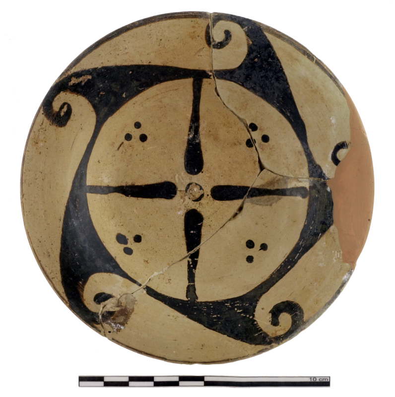 labbro estroflesso verticale, vasca distinta poco profonda, piede a tromba; decorazione dipinta con onde sul labbro, nel medaglione motivo a stella a quattro raggi con tre punti in ogni quadrante; esternamente fascia su vasca e piede. Argilla 10 YR 7/4 (very pale brown), vernice nera poco coprente e omogenea