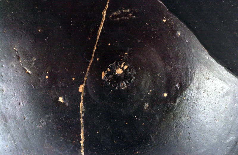 Orlo verticale, vasca emisferica, piede ad anello, fondo esterno ombelicato; piede risparmiato. Nella vasca, stampiglio centrale a rosetta. Argilla 7.5YR 7/4 (pink); vernice nera coprente e omogenea; segni di presa intorno al piede