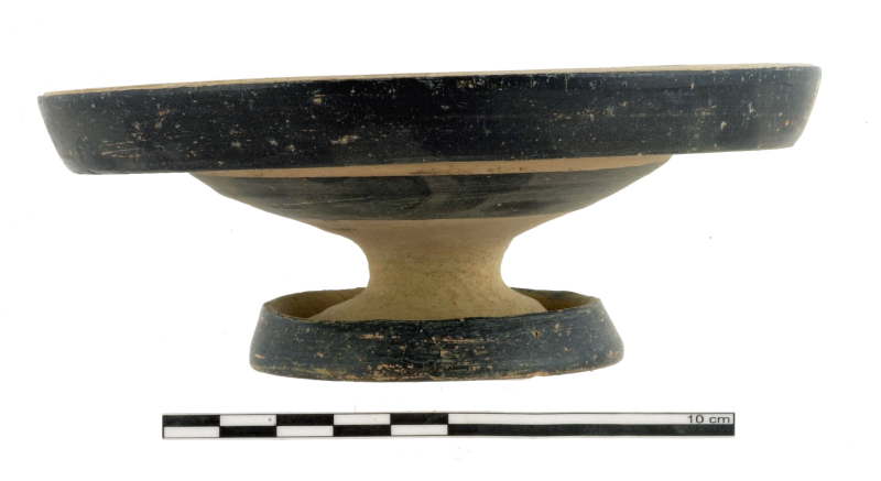 labbro estroflesso verticale, vasca distinta poco profonda, piede a tromba; decorazione dipinta con onde sul labbro, nel medaglione motivo a stella a quattro raggi con tre punti in ogni quadrante; esternamente fascia su vasca e piede. argilla 7.5 YR 7/4 (pink)