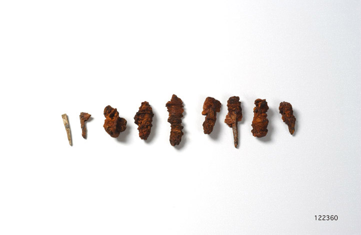 Serie di dieci chiodi di cui tre integri e altri mancanti di peduncolo. Forma circolare con peduncolo rettangolare
