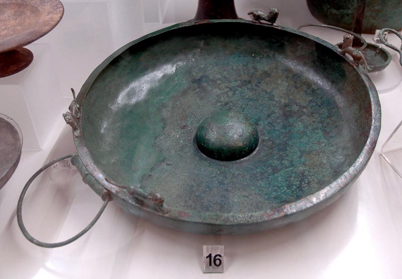 Bacile ombelicato di bronzo decorato sull''orlo con figure di leoncini in bronzo fuso. La tomba nel complesso è databile al 530-510 a.C
