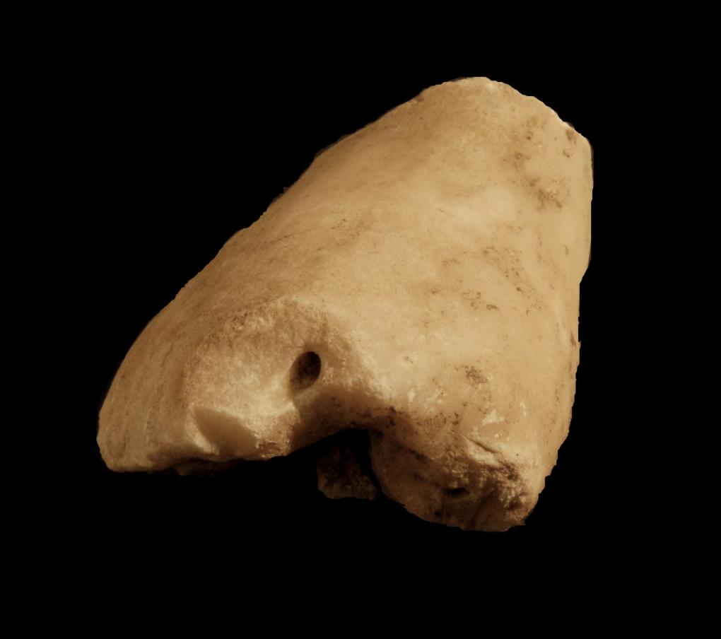 scultura e plastica, statuaria e rilievi, statua . Mano destra mutila di statua. Si conservano il metacarpo, da sotto le nocche fino all’attacco del polso (carpo), e parte della falange del dito pollice. La lavorazione appare piuttosto sommaria: il palmo non mostra pieghe rilevate, forse perchè destinato a contenere un oggetto, come suggerisce l’attacco visibile alla sinistra del pollice; il dorso è liscio. Foro cieco all’altezza dell’indice e nello spessore del pollice. Superficie liscia interessata da leggere scheggiature e incrostazioni