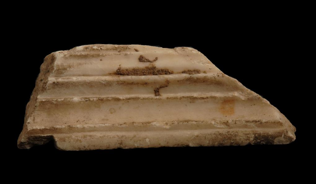 elementi architettonici e di rivestimento, rivestimenti parietali e pavimentali, incorniciatura modanata . Il frammento ha i fianchi e la superficie inferiore fratturati; la superiore superiore è lavorata a gradina, nel margine sinistro di essa si nota il foro tagliato a metà dalla frattura per il perno di fissaggio; il retro è liscio. La superficie anteriore ha una modanatura costituita da: (dall'alto) ovulo, cavetto, listello e gola rovescia