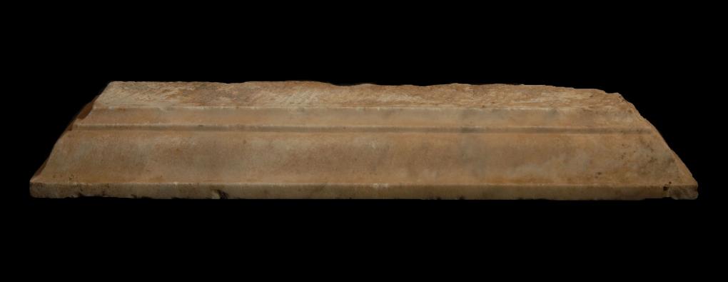 elementi architettonici e di rivestimento, elementi architettonici, coronamento liscio . La superficie superiore è lavorata a gradina ed ha due fori circolari per l'alloggiamento dei perni di fissaggio (diam. 1,5 cm), distasti tra loro 28, 5 cm; il retro ha, al centro, una sporgenza, lavorata grossolanamente, per l'ammorsamento dell'elemento e verso i fianchi ha la superficie ribassata con un'accenno di anatirosi. La superficie inferiore è lavorata a gradina. La faccia e i fianchi hanno una modanatura costituita da: (dall'alto) gola dritta e cavetto