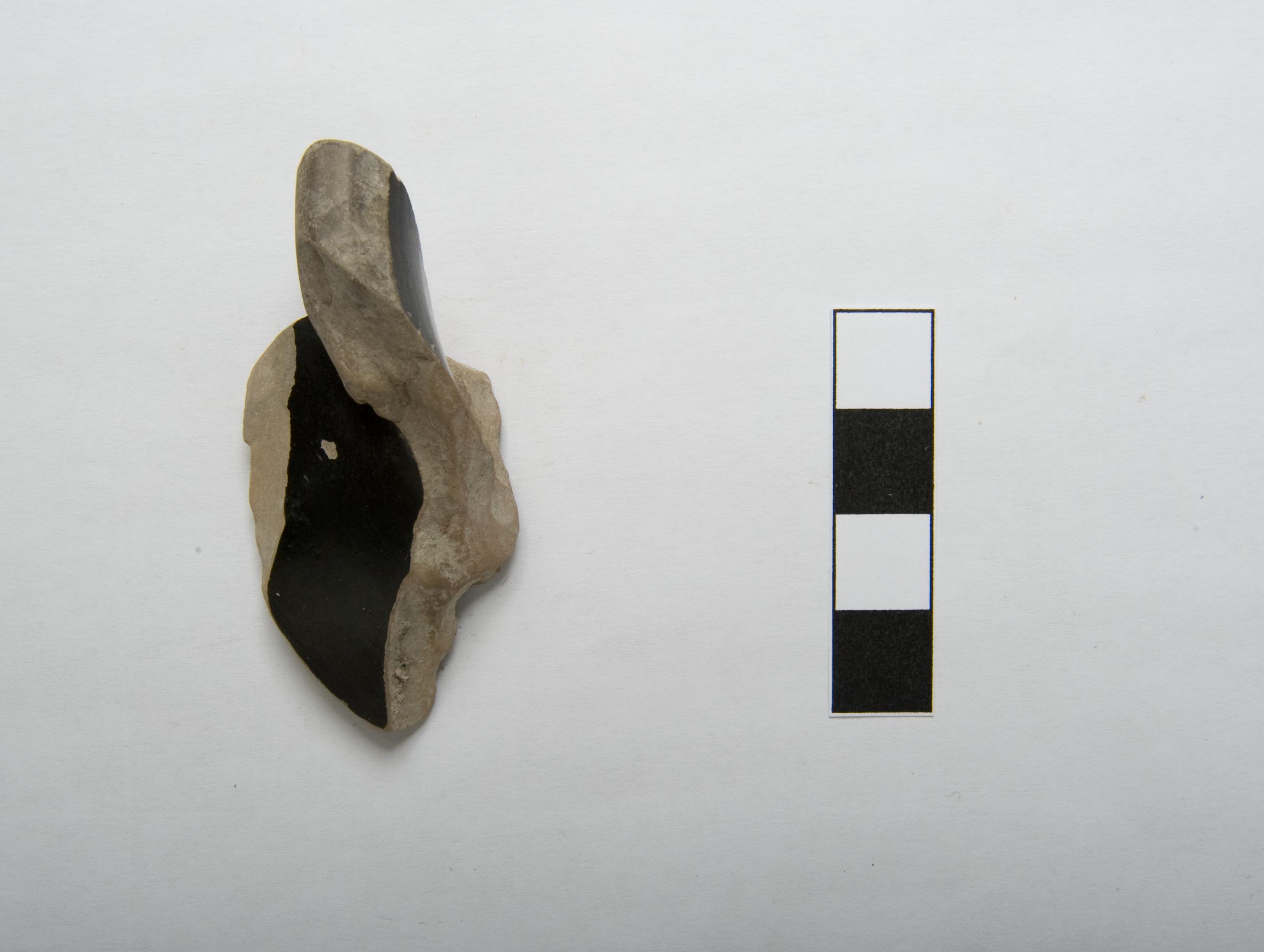 vasellame in ceramica, ceramica a figure nere, skyphos . Frammento del piede toroidale di uno skyphos. Orlo appuntito con uno spigolo in alto. Conservato l'attacco del corpo a vascaArgilla di colore bruno chiaro; vernice nera molto lucente. Risparmiati l'orlo e la base d'appoggio.Classe di produzione: "Skyphos attico di Tipo A"