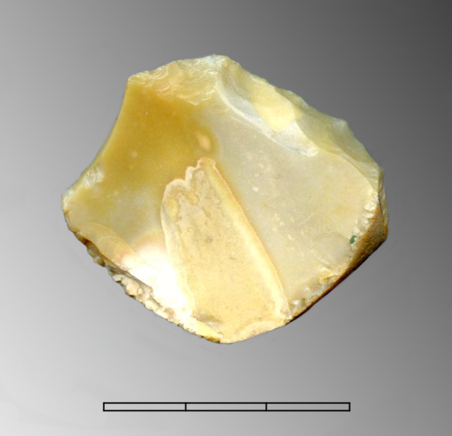 Raschiatoio trasversale in selce di colore beige con frattura sinistra. Lo strumento è stato realizzato sfruttando una scheggia con bulbo diffuso, tallone ed estremità prossimale corticali. Il ritocco è diretto, continuo, semplice, scagliato-scalariforme