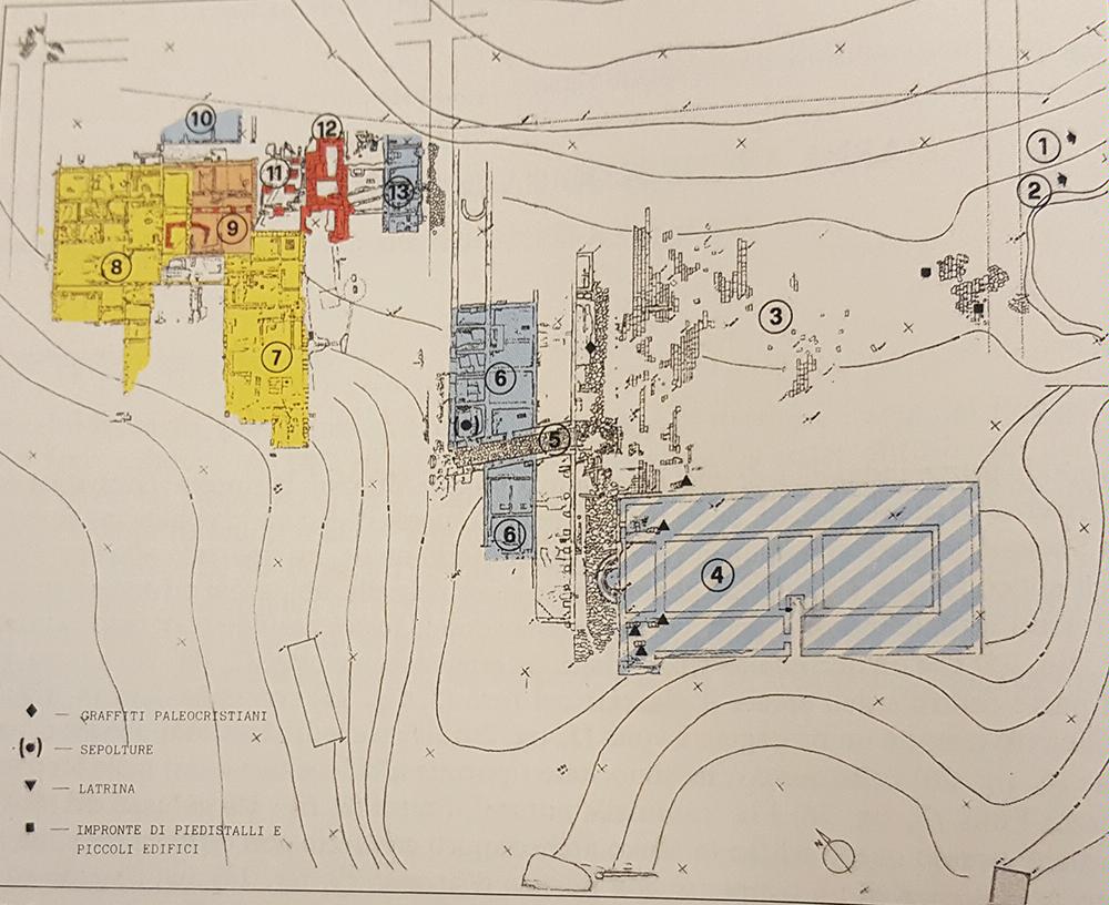 - INTERPRETAZIONE Nell'area di Poggio Moscini erano situati i principali edifici a carattere pubblico della città di Volsinii. La fase di maggior splendore del sito, collocabile in epoca primo-imperiale si insedia su un preesistente tessuto urbanistico del quale rimangono tracce nelle murature in opera quadrata e "a scacchiera" riulizzate o obliterate dalle nuove costruzioni. La viabilità di riferimento è caratterizzata dalla disposizione ortogonale degli assi viari che determinano una perimetrazione regolare degli isolati. Per ovviare alle difficoltà orografiche del sito tutta l'area insiste su due livelli terrazzati con murature in opera reticolata. L'area è frequentata fino in epoca tardo-antica come suggeriscono alcune incisioni rinvenute nelle lastre pavimentali del foro